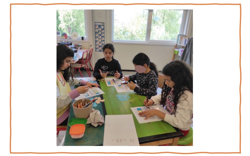 En atelier, nous construisons la base 10, à nouveau à l’aide de la méthode des Pas 10 qui nous aide à comprendre le groupements par 10 et la numérisation de position.