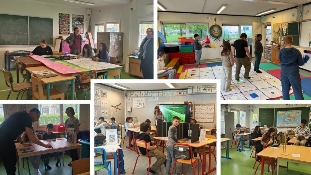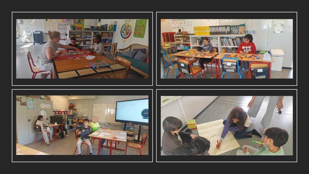 On continue en passant voir les oeuvres artistiques faites chez Madame Anne-Gaëlle, on joue à des jeux de société avec Monsieur Johan. Chez les Aubépines, on apprend en toute liberté et chez les Tournesols, on travaille la géométrie avec les tablettes.