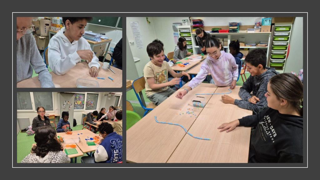 Aujourd’hui, nous avons travaillé les unités et les dizaines à l’aide des perles bleus et oranges. 10 perles bleues pour 1 perle orange et hop on en fait un long collier jusque 100.