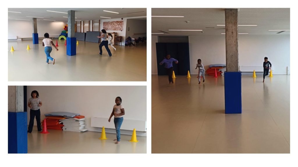 La classe des Lavandes a son cours de gymnastique dans la salle de psychomotricité de l’école du Bempt. C’est un bel espace pour courir en jouant ou pour faire des courses de vitesse!